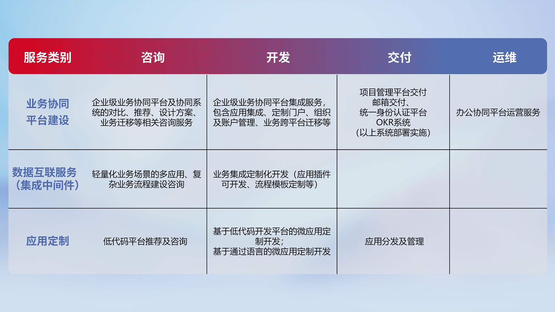 针对钉钉、、企微、、、、IDaas等平台级产品提供产品的规划、、、方案、、交付、、定制化开发等服务,,实现如统一协同办公、、智能客户服务、、、、混合会议管理、、智能数据查询、、等业务场景,,实现数字化转型。。。